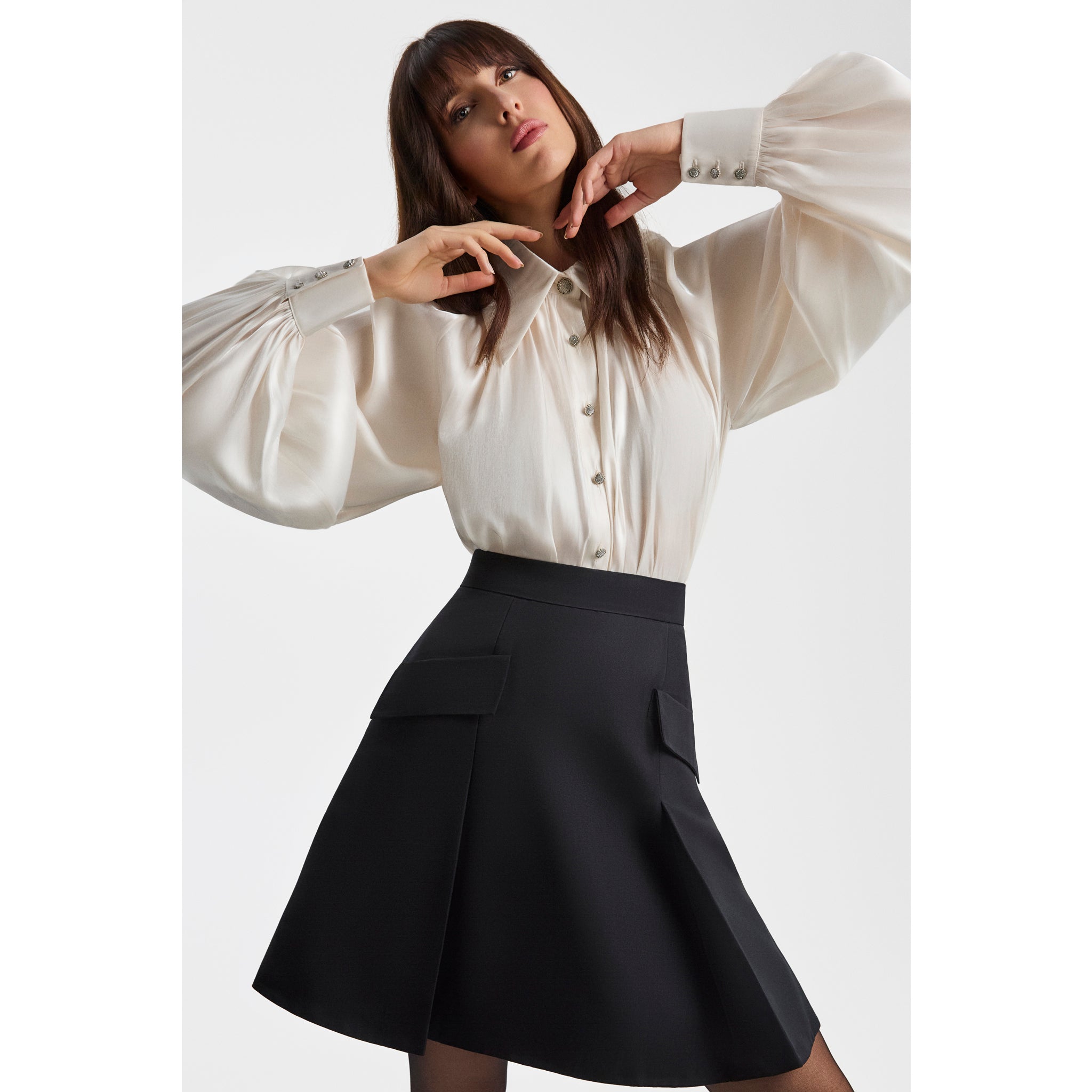 This Pearl White shirt features a gathered neck and voluminous raglan sleeves, creating a sophisticated and feminine silhouette. Crafted from semi-sheer, crease-resistant fabric, it subtly sparkles in low light, making it ideal for both day and evening wear. The sparkling metal buttons add a luxurious touch, completing this modern, elegant piece.